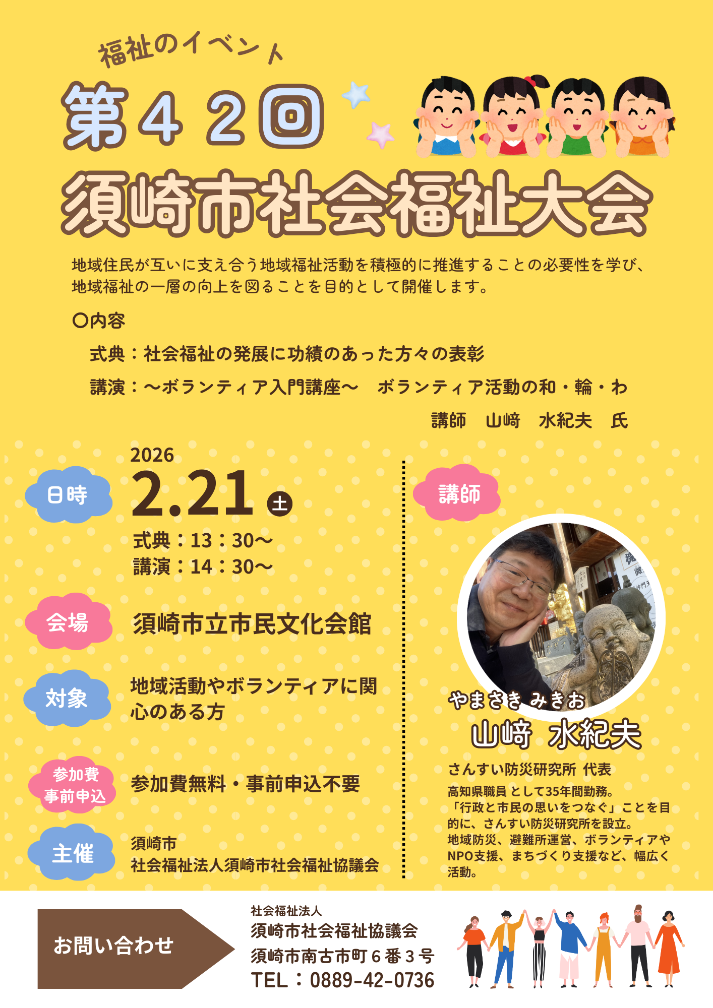 地域住民が互いに支え合う地域福祉活動を推進し、より住みよいまちづくりを目指して以下の概要で「第42回 須崎市社会福祉大会」を開催いたします。